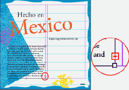 3. Текст перетекает в новый фрейм в нижней половине первой колонки на странице 3. Когда в текстовом фрейме находится больше текста, чем может вместить фрейм, во фрейме выводится сообщение об избыточном тексте. На наличие избыточного текста указывает красный символ знака «плюс» (+) на внешней границе фрейма (небольшой квадратик непосредственно над нижним правым углом фрейма). Можно связать избыточный текст с другим фреймом или создать новый фрейм, в который будет перетекать избыточный текст, или расширить размер фрейма.